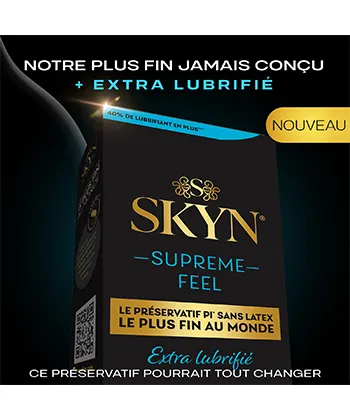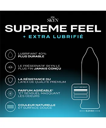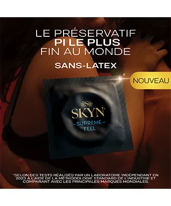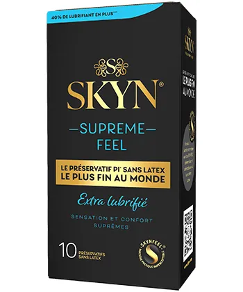 Pour ressentir un maximum de sensations entre les 2 partenaires, les capotes se font de moins en moins épais. Ultra-fin c'est moins de 60 microns (0.06 millimètres) entre toi et ta/ton partenaire. Évidemment tous ces préservatifs sont aussi solides que les autres et respectent la norme CE. Ceux qui ont achetés Skyn Supreme Feel Extra Lubrifié apprécient son extrême finesse et les sensations qu'il procure. Lisez les commentaires de nos clients sur Skyn Supreme Feel Extra Lubrifié et comparez nos offres en Préservatif ultra-fin.SKYN, le preservatif sans latex numéro 1 au monde
